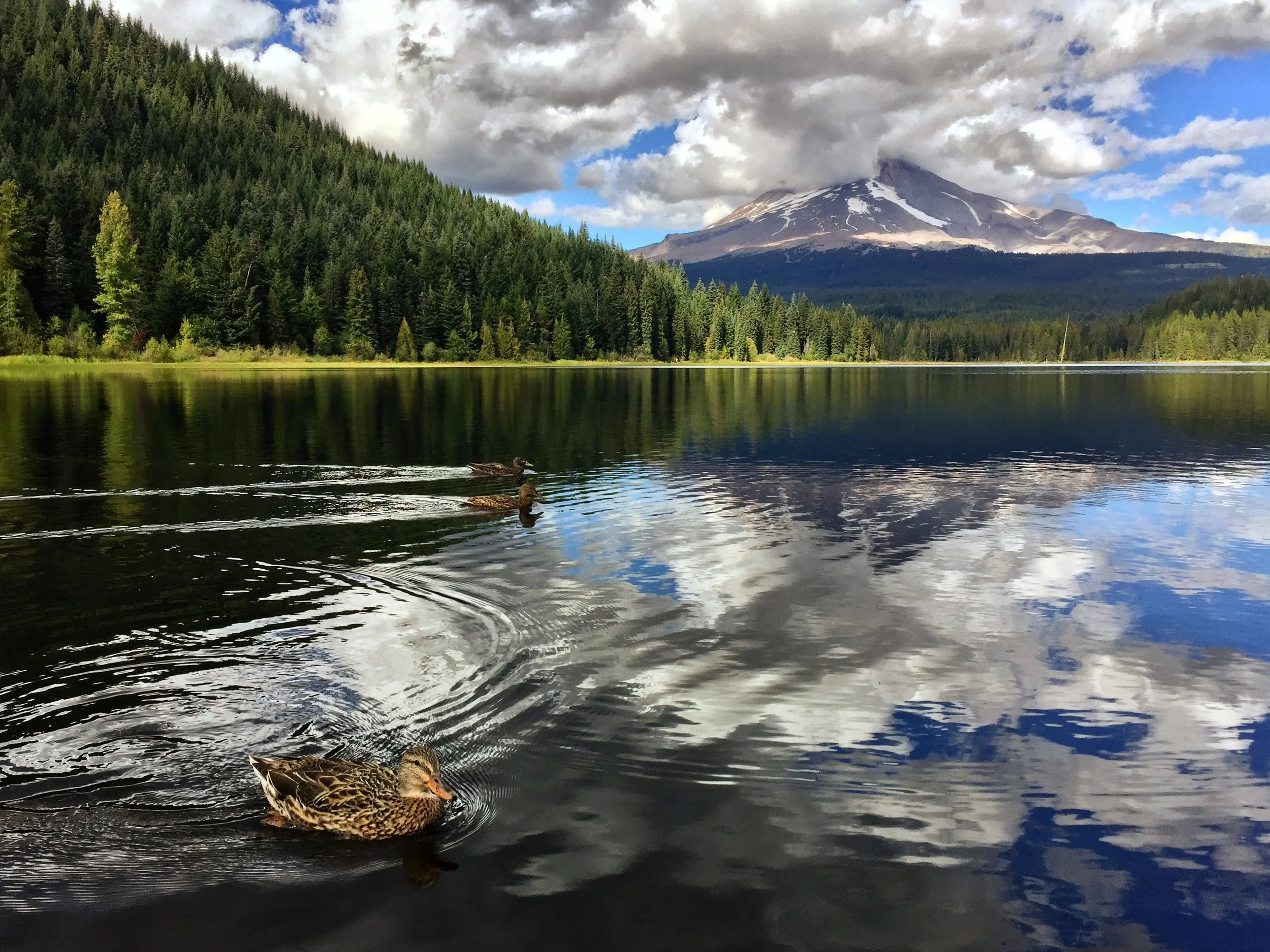 An iPhone shot of some ducks swimming in Trillium Lake with Mt. Hood in the background.