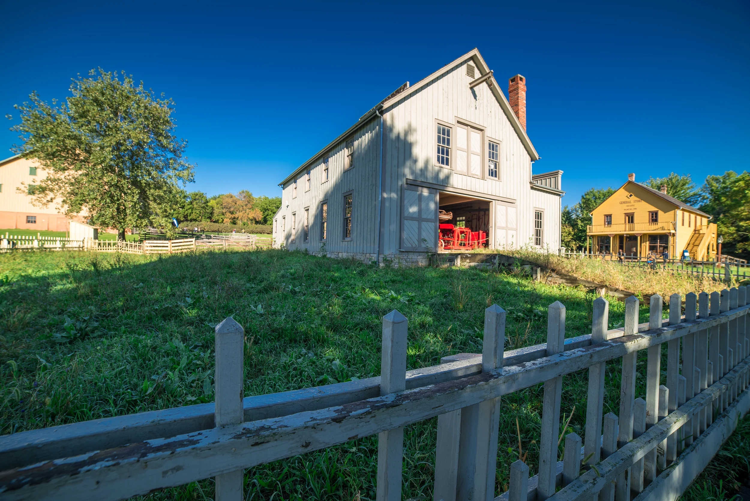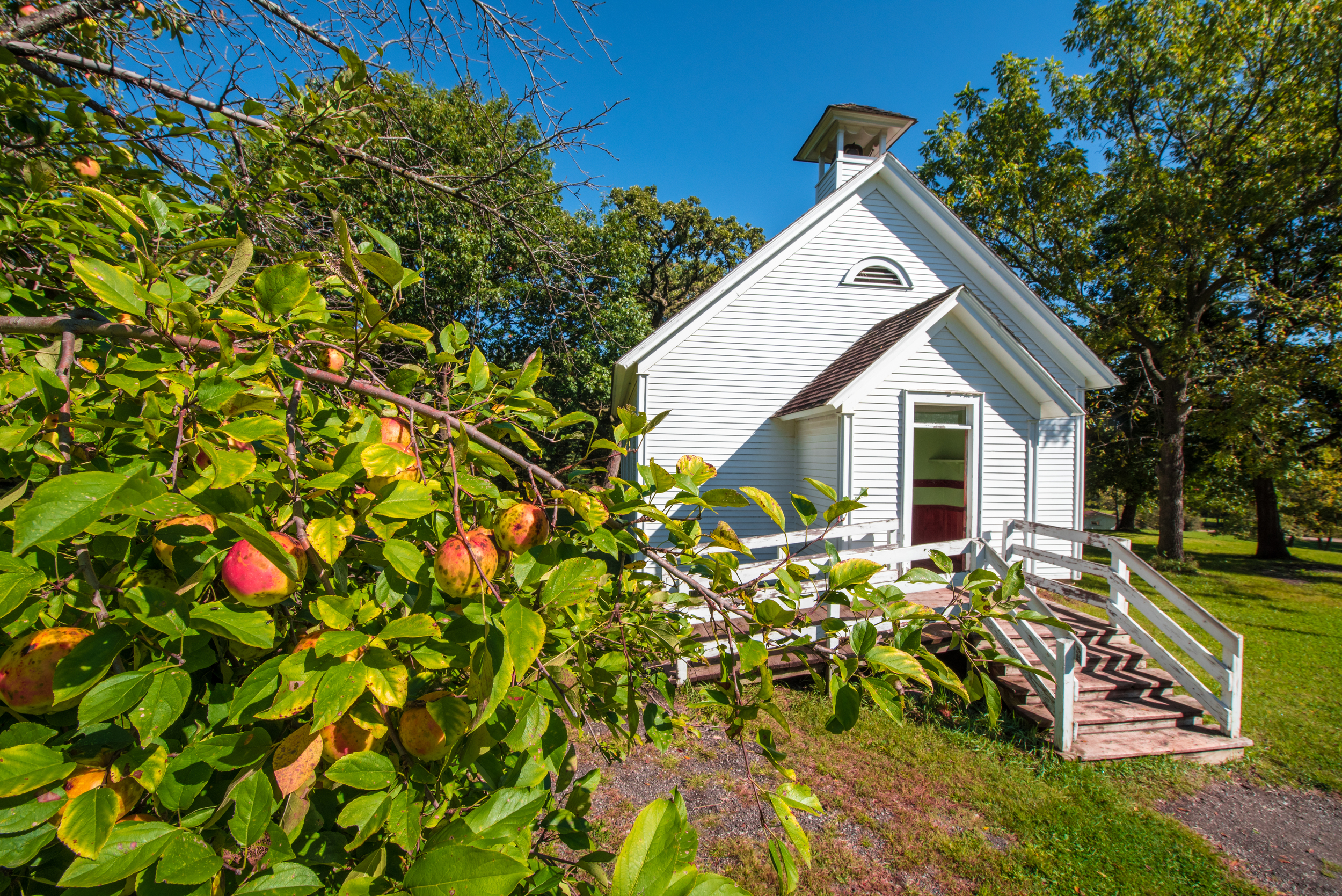 Showing relationship between things like this shot of apples and an old schoolhouse.